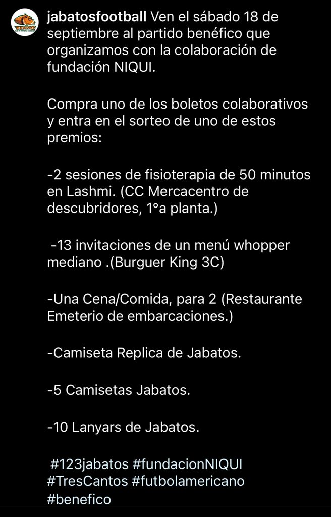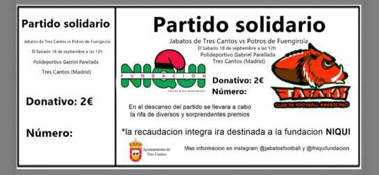 FUNDACIÓN NIQUI en colaboración con el Club Jabatos Tres Cantos, han organizado un partido benéfico de futbol americano que se celebrará el próximo sábado 18 de septiembre en el polideportivo Gabriel Parellada (La Luz) de Tres Cantos, con la participación de los Potros de Fuengirola.